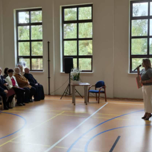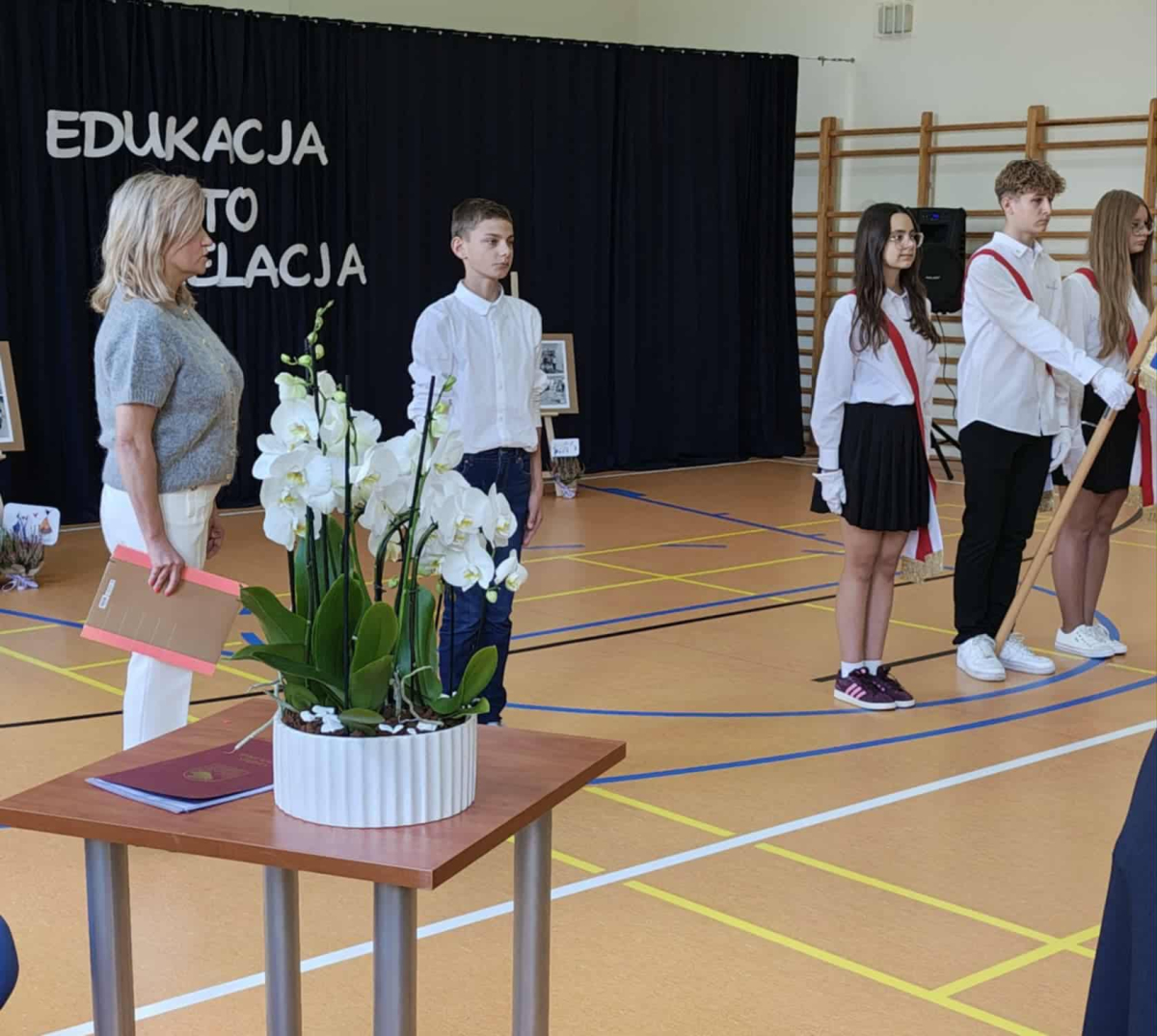 Pani Dyrektor Karolina Trych przekazała życzenia z okazji święta edukacji, wyrażając wdzięczność za zaangażowanie całej społeczności szkolnej. Wręczyła również nagrody wyróżnionym nauczycielom oraz podziękowała uczniom klasy VII i klasy VIII za piękny występ, który uświetnił tę wyjątkową akademię.
