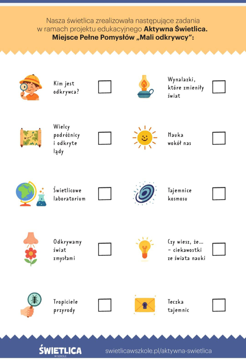 Z radością informujemy, że nasza szkoła dołączyła do ogólnopolskiego projektu edukacyjnego „Aktywna świetlica. Miejsce pełne pomysłów”. Program ten ma na celu dostarczenie nauczycielom inspiracji oraz pomysłów na ciekawe i angażujące zajęcia świetlicowe, które można realizować przez cały rok szkolny. W każdej edycji projektu uczniowie będą mieli okazję uczestniczyć w nowatorskich tematach i realizować różnorodne zadania.