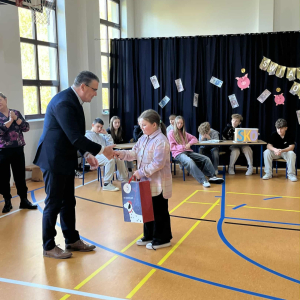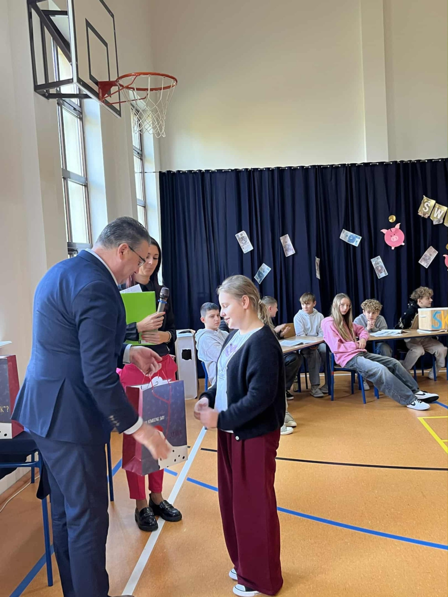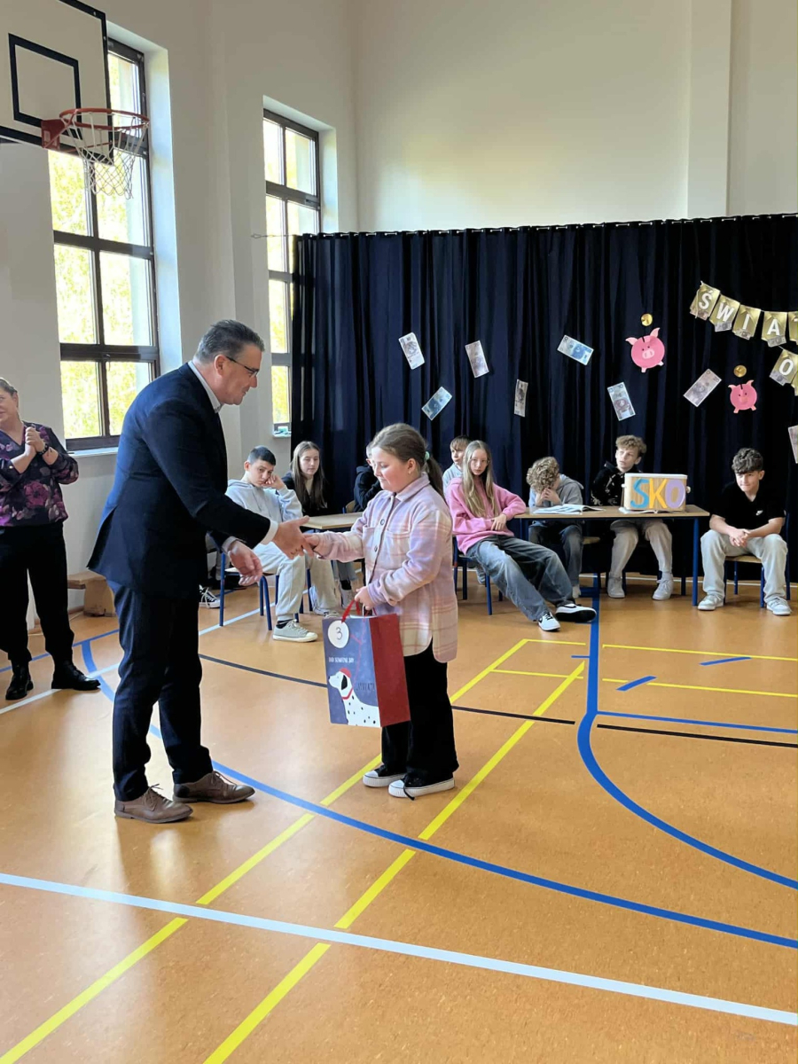 Podczas apelu wręczono nagrody dla najbardziej systematycznie oszczędzających uczniów oraz upominki dla nowych członków SKO.